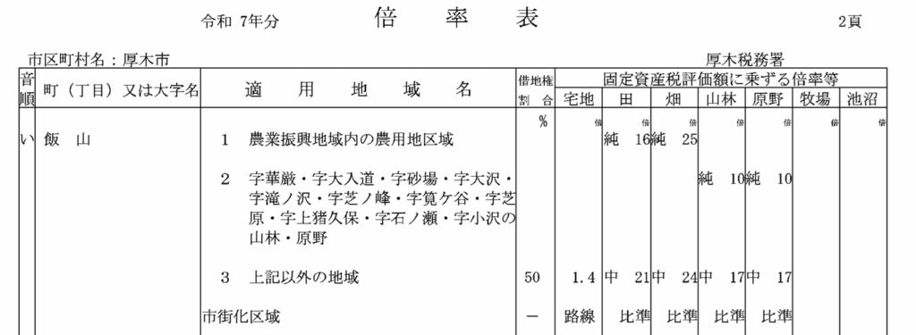しかし、対象地が都市圏にある場合そうはうまくいかないのであって、倍率表に「純」が見つからないことも多々あります。そのような場合には、仕方ないので隣の自治体の倍率表を調べます。それでも見つからなかったらその隣、だめならその隣・・・、と探していくことになります。